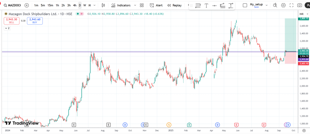 Mazagon Dock Shipbuilders Ltd (MAZDOCK) presents a strong opportunity for a swing trading. As we know, swing trading has the potential for higher returns per trade, and unlike day trading, it does not require constant market monitoring throughout the day, making it ideal for everyone.